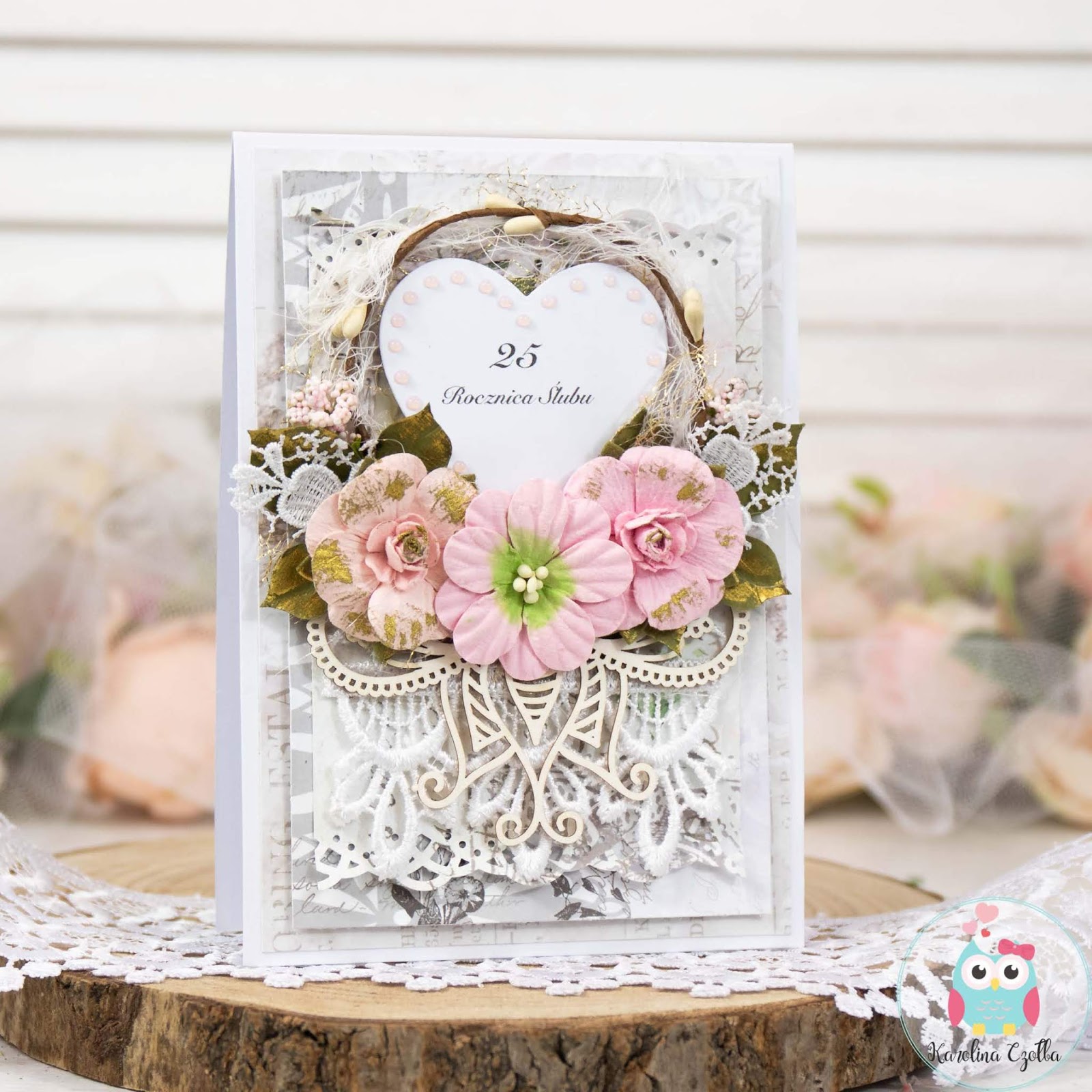 Kartka jak zwykle ostatnio jest wielowarstwowa, ozdobiona pięknymi papierowymi kwiatami koronkami i listkami z wykrojników Lady E design.
